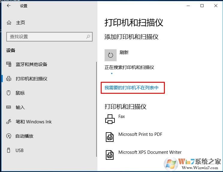 3、一会候这时应该是搜索不到打印机的,这里我们再点击我需要的打印机不在列表中;