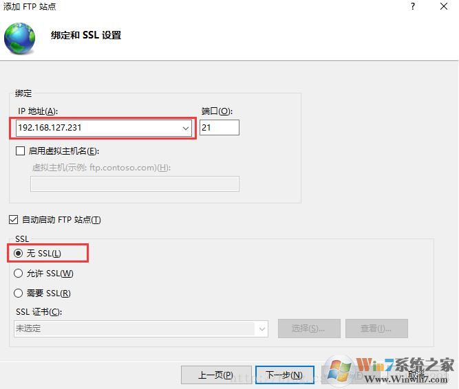4、IP地址填FTP本机IP,选择无SSL (如果有域名绑定的话也可以绑定域名)