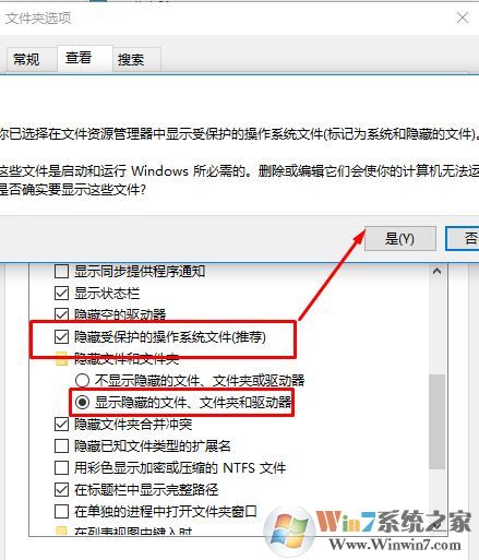 2、在文件夹选项窗口切换到 查看 ,在下面点击【显示隐藏的文件、文件夹和驱动器】,接着将 隐藏受保护的系统文件 的勾也去掉,此时会弹出提示框,点击“ 是”即可;