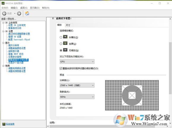 四、右键桌面进入NViDIA控制面板,然后调整桌面尺寸和位置中把缩放模式改成无缩放,对以下项目执行改成GPU,覆盖游戏和程序设置的缩放模式打勾,保存应用即可。