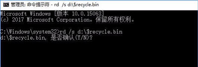 2、在命令提示符中输入: rd /s x:\recycled 按下回车键 X代表出现问题的磁盘盘符,如D盘出现问题那么这么输入:rd /s d:\recycled