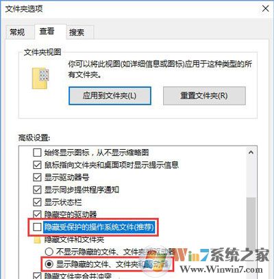 2、切换到 查看选卡,移动到下面点,然后按提示将隐藏受保护的操作系统文件 的勾去掉,弹出提示的点击“是”,点击显示隐藏的文件、文件夹和驱动器 点击确定;