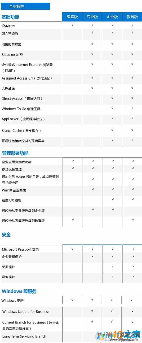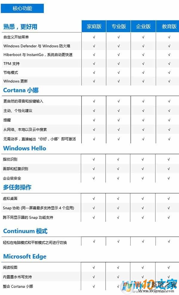 一张图让你看懂Win10专业版和家庭版的区别: