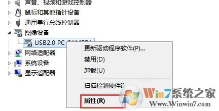 第二步、打开设备管理器后,找到你刚安装驱动的设备(显示设备),然后右键点击“属性”(下面以摄像头为例,其他设备操作相同);