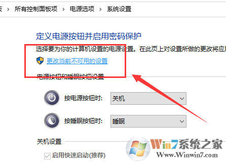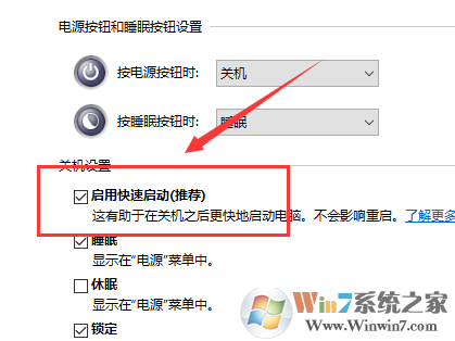 第四步:接着把“关机设置”中“启用快速启动(推荐)”前面的复选框对勾去掉,保存修改即可。