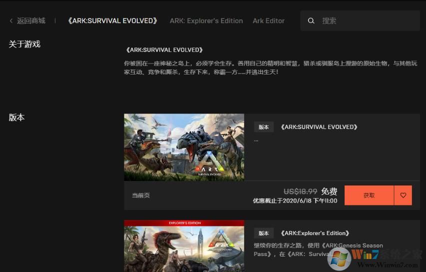 3、商城里面 找到方舟生存进化这款游戏,可以看到显示现在免费。