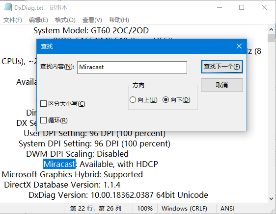 4. 最后我们打开刚保存的文本文件搜索“Miracast”