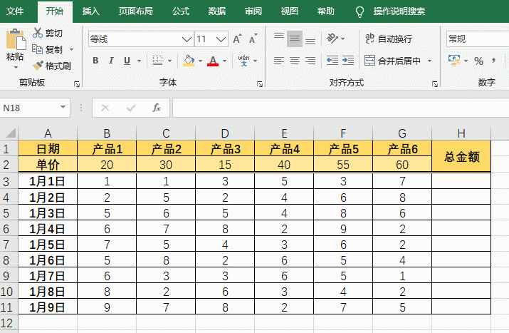 单价不同,数量不同,但需要快速求和怎么办?方法也很简单,就是每种商品先相乘后加在一起求总金额,使用公式:=SUMPRODUCT($B$2:$G$2,B3:G3)就可以啦。