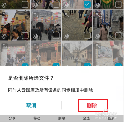 6、点击后,在下方的是否删除所选文件中,点击删除的选项即可。通过删除无用的云照片,即可释放云空间;