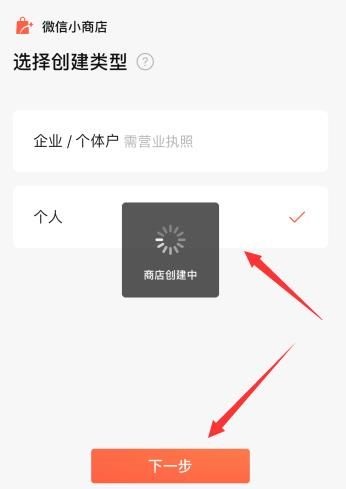 4、选择店铺创建的类型,勾选下方的协议,点击下一步;