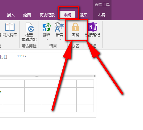 3、点击之后,OneNote界面的右侧就会有一个设置密码的选项,可以选择当前分区的密码设置,也可以选择所有分区的密码设置;