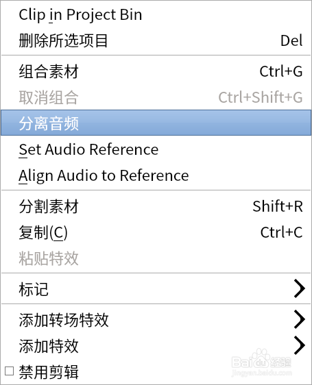 4、选中需要替换声音的视频,点击右键进行【分离音频】;