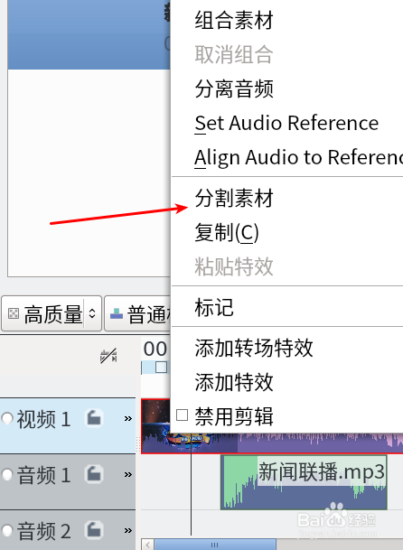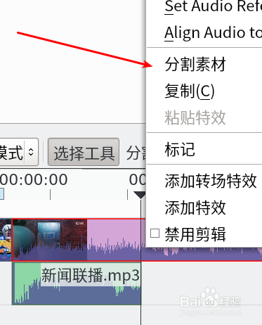 2、拖动指针到视频背景音乐需要替换的开始位置,右键点击视频,点击【分割素材】;