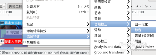 5、右键分离的音频,然后【添加特效】-【音频矫正】-【静音】;