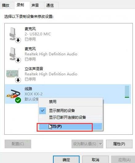 3、我们也可以点击右下角【声音】图标,点击【录制】,鼠标右击【线路】,点击【属性】;
