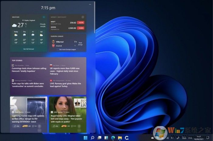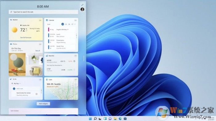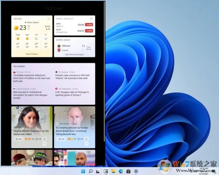 由于这显然是Windows 11的一个非常早期的版本,这些小部件并没有在操作系统中完全加载,但它们被设计成滑出,并提供对新闻、天气和其他网络内容的快速访问。