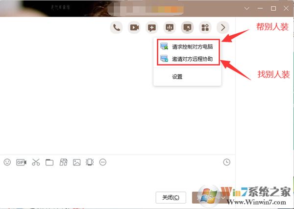 1,先登录QQ打开,点击“远程协助”按钮,如果是帮别人安装安装系统的话,就点击“请求控制对方电脑”,如果是要请求远程安装,就点击“邀请对方远程协助”。
