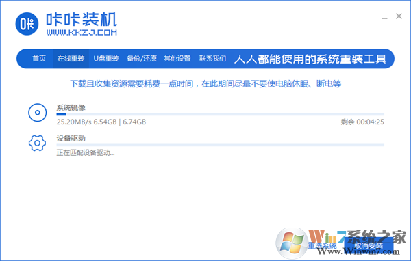 6,以上步骤完成后,咔咔装机开始执行系统镜像下载,等待镜像下载完成后电脑自动重启完成最后的安装。