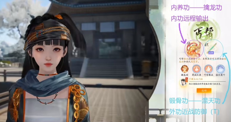 丐帮以棍法和掌法为主的战斗手段,拥有强大的输出能力和高防御能力,代表人物为洪七公。丐帮的技能包括“飞龙在天”“见龙在田”“潜龙勿用”和“天下无狗”等,这些技能既有攻击也有控制效果。