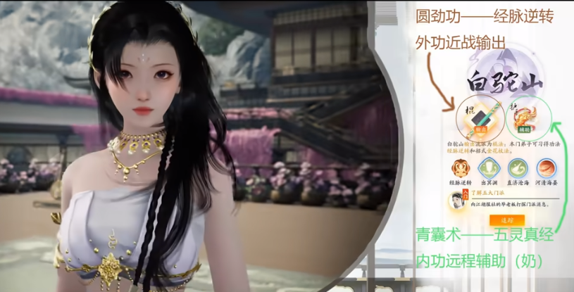白驼山代表人物为欧阳锋,使用棍和护手作为武器。白驼山的输出能力在终测中表现突出,但缺乏复活技能,因此在团队中可能有一定的局限性。