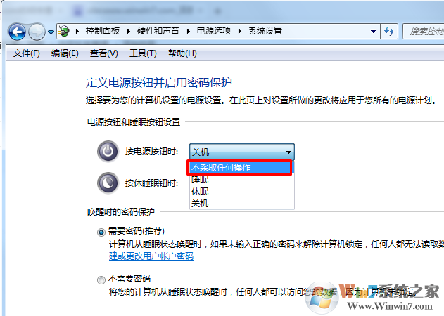 4、打开“选择电源按钮的功能”后,我们在“按电源按钮时:”后面的“用电池”和“接通电源”的下拉菜单中,分别选择“不采取任何操作”。