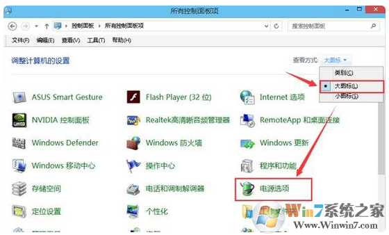 2、在 控制面板的查看方式里选择“大图标”,然后在下方找到“电源选项”,点击;