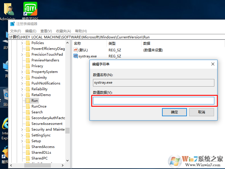 4、双击systray.exe键值,将其值修改为C:WindowsSystem32/systray.exe,确定。