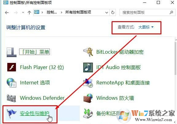 1、首先按【Win+X】快捷键,进入控制面板,在查看方式为“大图标”的情况下选择“安全性与维护”