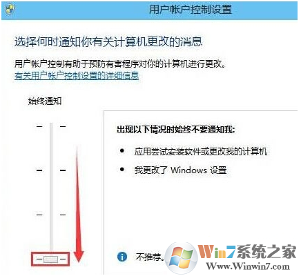 3、在“管理与维护”框的左侧点击“更改用户账户控制设置”,把滑条拉到底部“从不通知”点击确定。