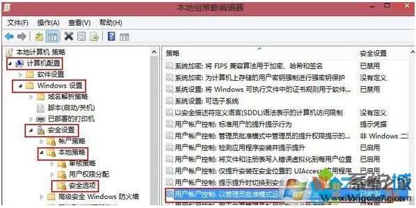 5、在左边选择【计算机配置】→【Windows设置】→【安全设置】→【本地策略】→【安全选项】,在右边下边选择【用户账户控制:以管理员批准模式运行所有管理员】,并且双击后选择【已禁用】,最后重启,即可完全关闭用户账户控制;