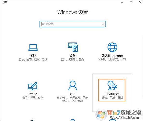 1、按Win+i打开设置界面,点击其中的“时间和语言”选项。