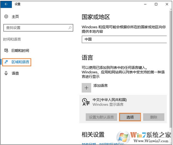 2、点击“区域和语言”,在右侧点击“中文”下的“选项”按钮。