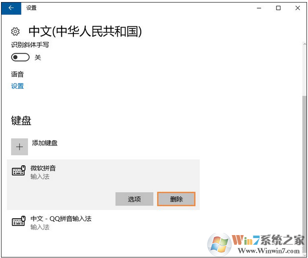3、点击“微软拼音”选项就会出现“删除”按钮,点击删除就可以了。
