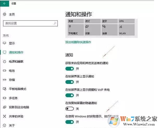 还有一些广告,是出现在win10通知中心的,同样我们也有一些方法控制它。比方说在“设置”→“系统”→“通知和操作”下,便有“获取来自应用和其他发送者的通知”、“在使用Windows时获取提示、技巧和建议”两项开关控制它。