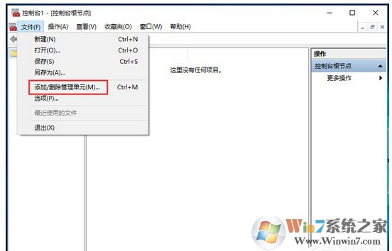 4、待打开“控制台”界面后,点击“文件”-“添加/删除管理控制单元”项,设置并添加相关控制单元;