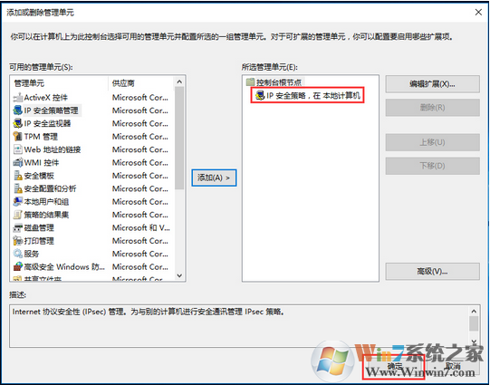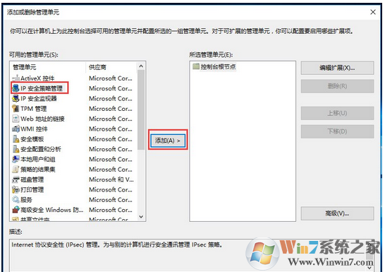 5、从打开的“添加或删除管理单元”窗口中,就可以根据自己的实际需要选择并添加相关控制单元;