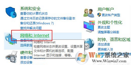 2、接着会弹出控制面板窗口,在窗口里面选择【网络和Internet】。