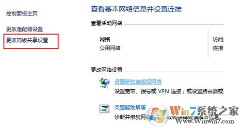 4、在窗口的左侧列表位置找到【更改高级共享设置】点击选择它。