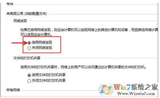 5、这时就会出现发现共享的设置了,在网络发现里面点击选择【启用网络发现】。