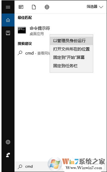 1、按Win+S打开搜索框,在搜索框中输入cmd,在列表中右键命令提示符选项“以管理员身份运行”并打开。