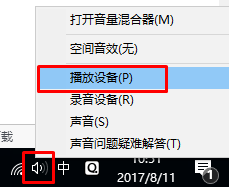 1、在任务栏的小喇叭上单击右键,选择【播放设备】,查看是否有2个扬声器,如果没有从realtek官方下载驱动进行安装;
