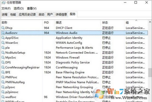 2、按下【ctrl+shift+esc】打开任务管理器,切换到服务界面,找到“audiosrv”服务,右击点停止 ;