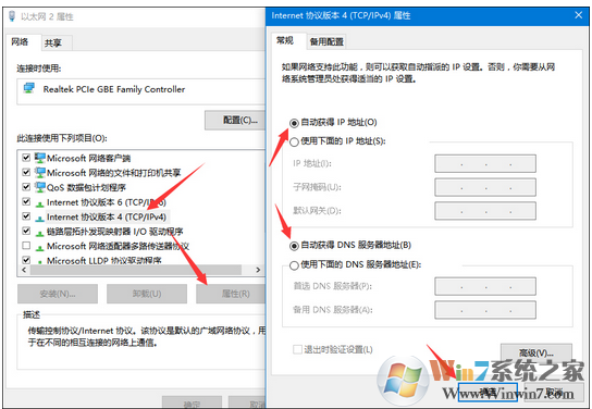 2、打开IPv4协议的属性,将IP地址和DNS服务器地址设置为自动获取,点击确定退出即可。