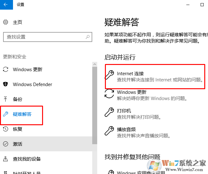 3、选择疑难解答。在右侧找到internet连接的疑难解答。