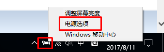 笔记本直接找到右下角电源标志,右键选择电源选项。