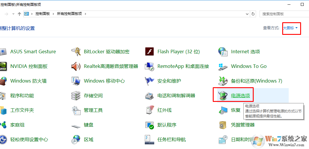 台式机,下进入控制面板、选择大图标、找到电源选项。