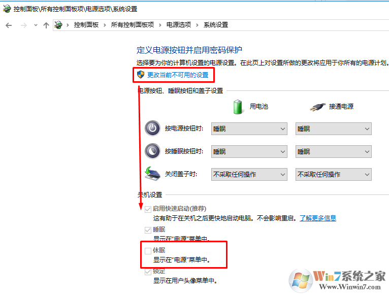 3、在下图中我们就可以看见休眠的选项了,但是没有勾选、所以我们在开始菜单中是看不见休眠功能的,但是下面是黑的无法勾选怎么办?这时我们就需要点击一下更改当前不可用的设置,然后就能发现休眠可以勾选了。勾选之后确认退出。