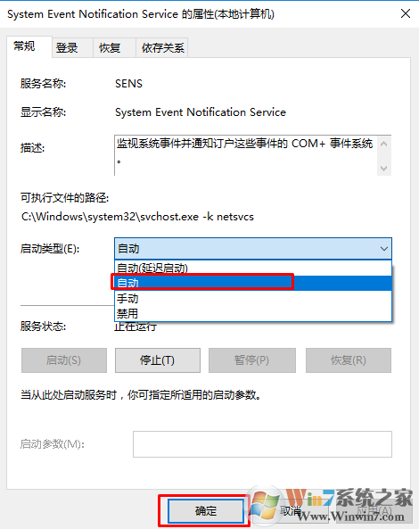 2、找到并双击打开 System Event Notification Service,将启动类型修改为“自动”,点【应用】-【启动】-【确定】即可;