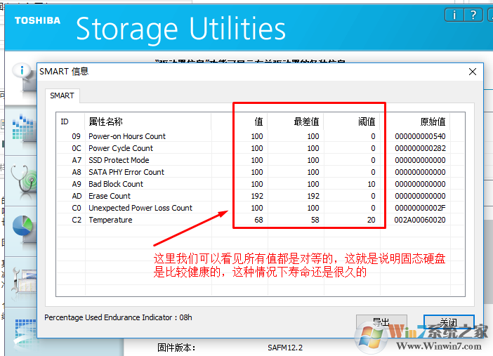 2、点击SMART查看详细信息,如下图所示这里我们可以看见所有值都是对等的,这就是说明固态硬盘