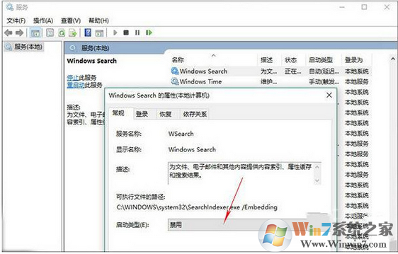 点击Cortana搜索框,输入“服务”进入本地服务列表,查找并双击“Windows Search”,将其属性修改为“禁用”。